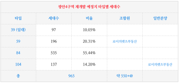 수영구 광안4구역 재개발 예정지의 추진위 측에서 예상한 타입별 세대수 입니다.