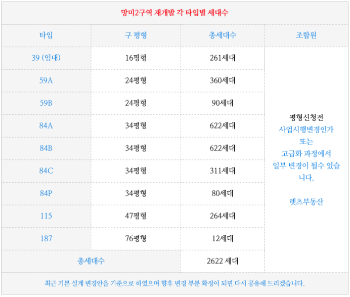 사업시행계획인가 변경 등에서 최종 설계등이 확정되면 일부 타입의 변경이 생길수도 있을 것으로 보입니다.