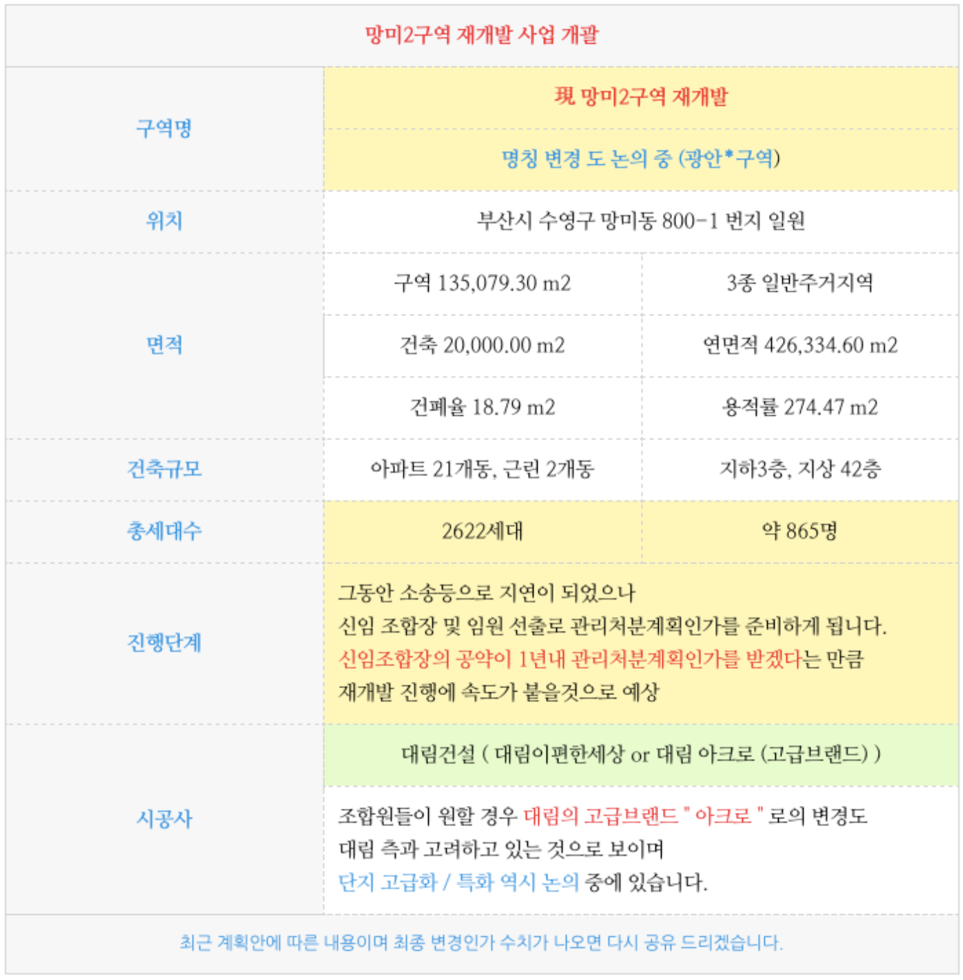 - 저평가에서 많이 회복하였지만 입지적 장점과 진행단계에 비해서 상대적 저평가 되어 있어 향후 상승여력이 있어 보입니다 ( 수영구의 예정지들의 프리미엄이 대단히 높은 상황 )