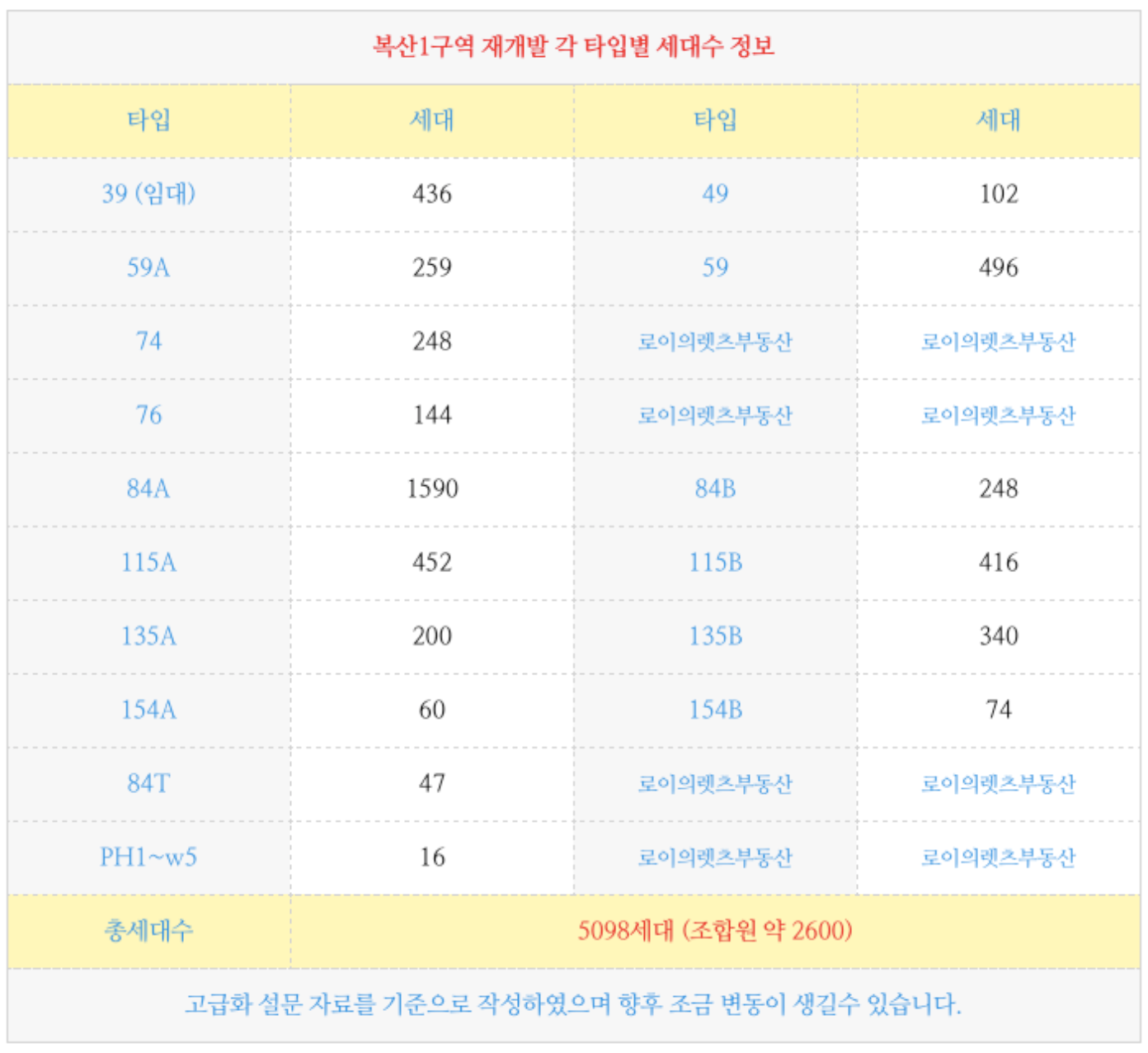 동래구 복산1구역 재개발은 현재의 각 타입별 세대수입니다.