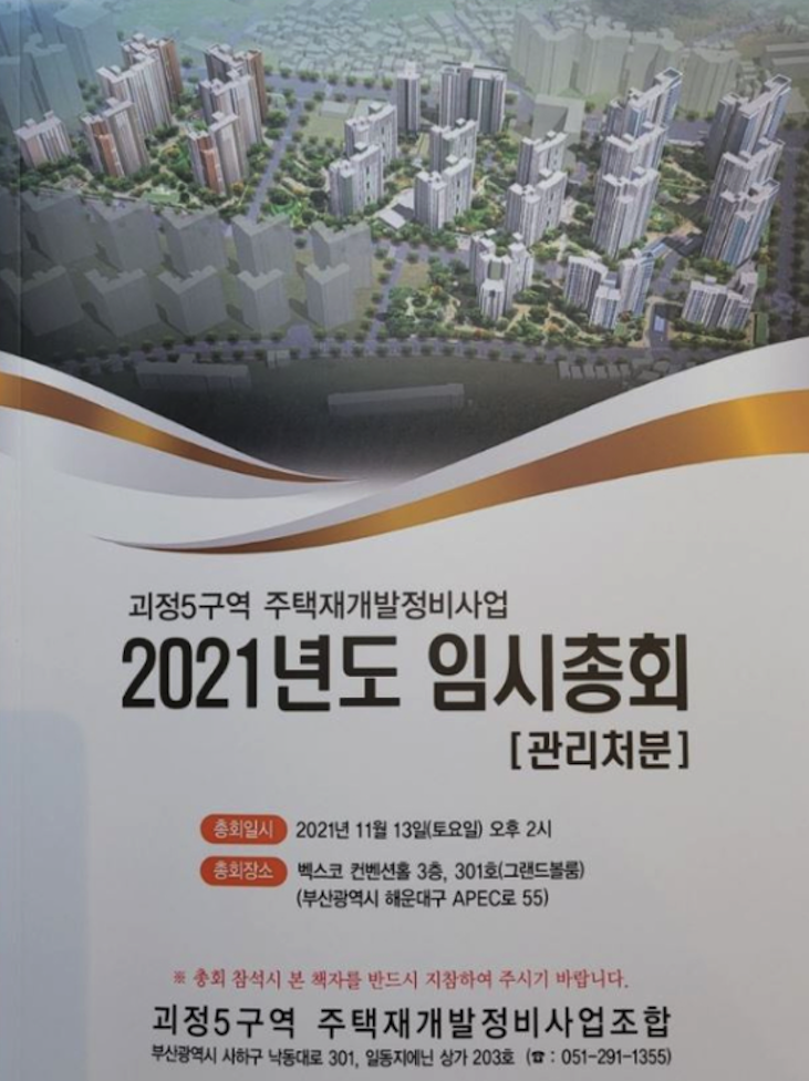 괴정5구역 재개발의 최근 소식은 관리 처분을 위한 조합 총회가 예정되어 있습니다.