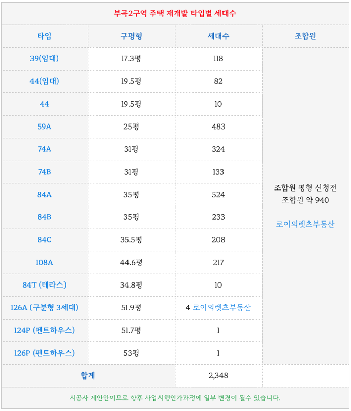 부곡2구역 재개발의 시공사 제안안을 기초로 한 타입별 세대수 입니다.
