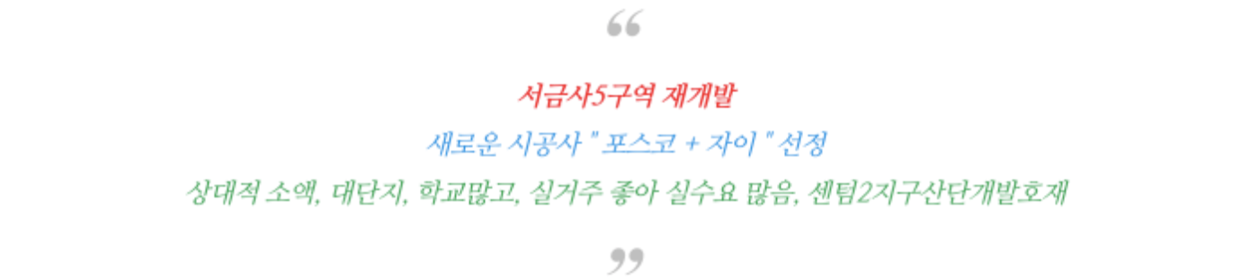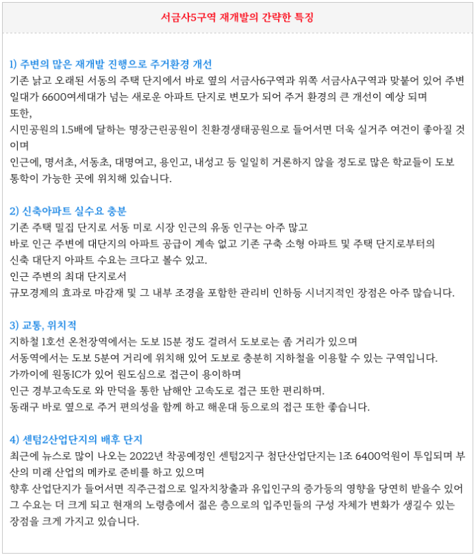 서금사5구역 재개발의 간략한 특징을 정리하였습니다.