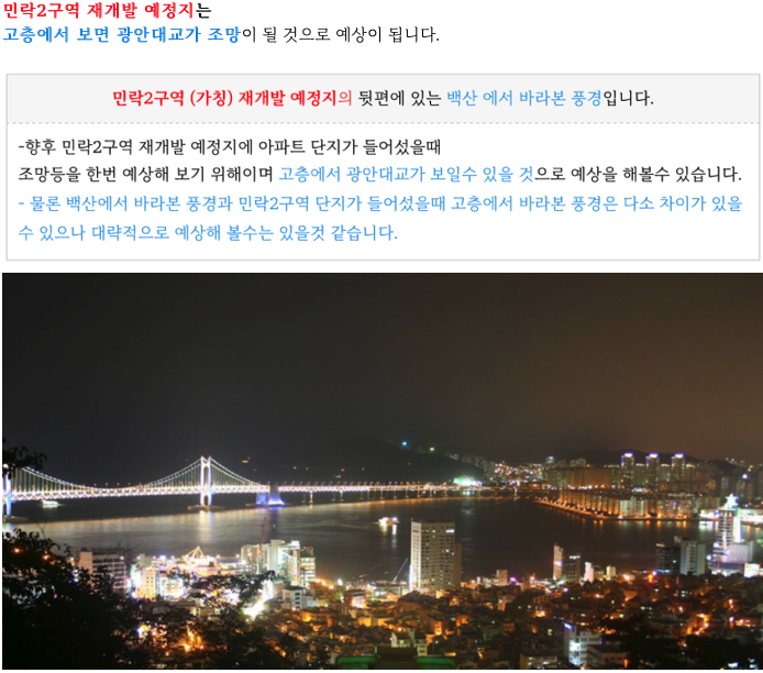 민락2구역 (가칭) 재개발 예정지에 관심이 있으신 분들은 연락주시면 자세히 설명드리겠습니다.