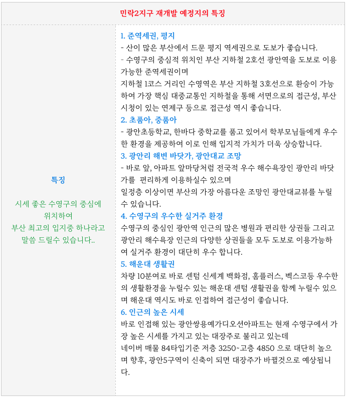 광안리해변앞 민락2지구 재개발 예정지의 특징을 간략히 정리하였습니다.