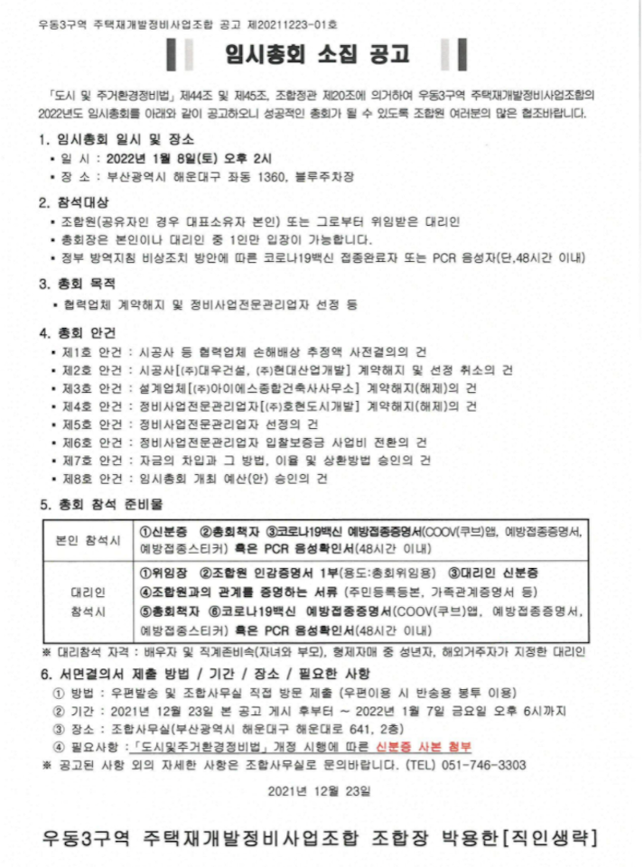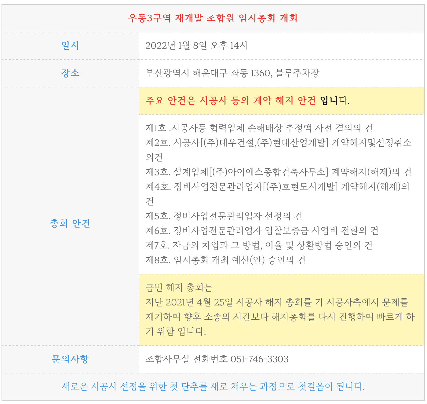 우동3구역 재개발 의 최근 소식으로는 1월 8일 앞두고 있는 임시총회 입니다.