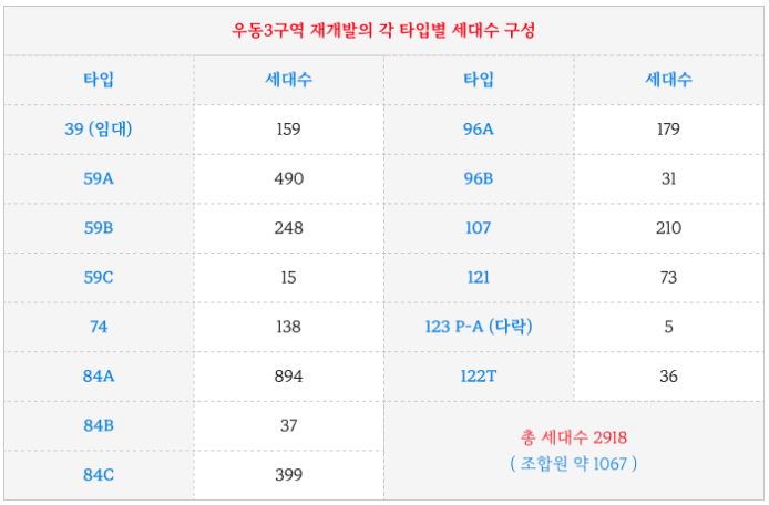 해운대 우동3구역 재개발의 타입별 세대수 입니다.