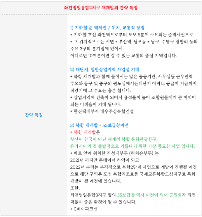 좌천범일통합2지구 재개발의 주요 특징들입니다.