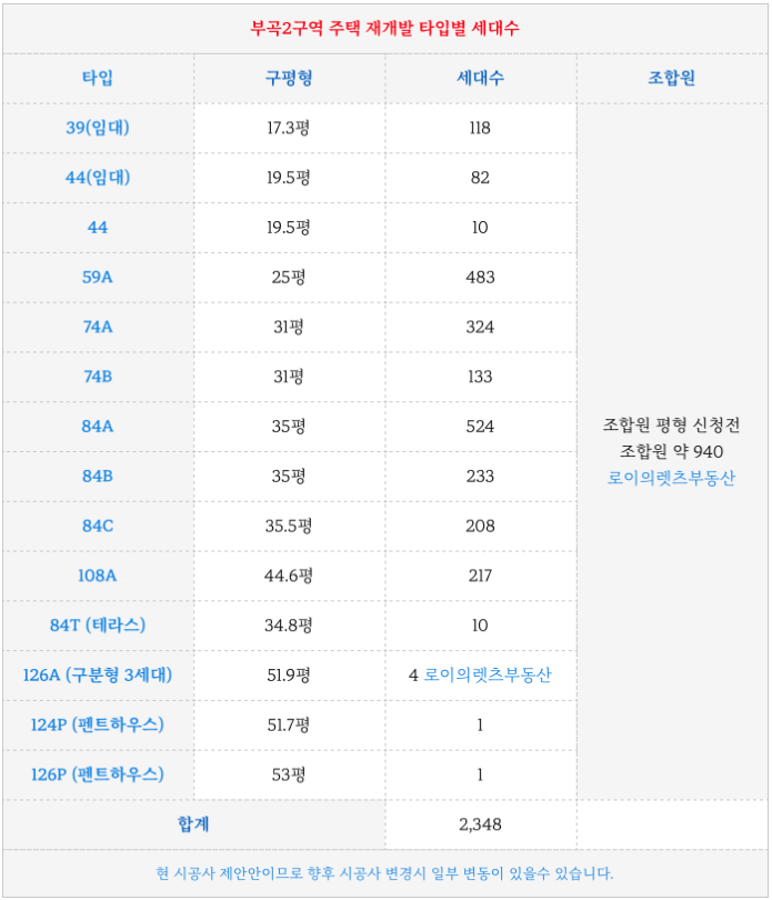 부곡2구역 재개발의 타입별 세대수 입니다.