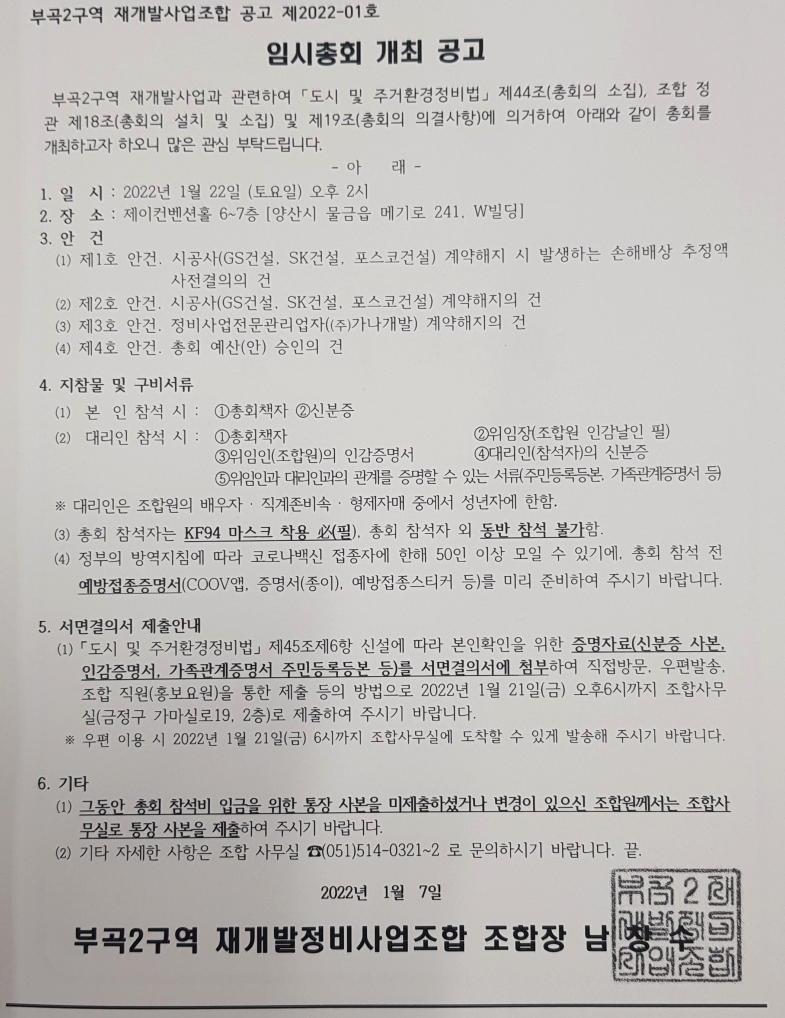 부곡2구역 재개발 시공사, 정비업체 계약해지 위한 임시총회 소식과 현 물건들을 업데이트 해 드리겠습니다.