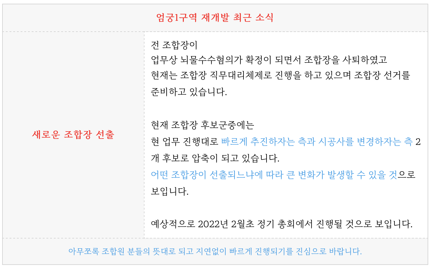 조합장을 새로 선출하는 이슈가 있습니다.
