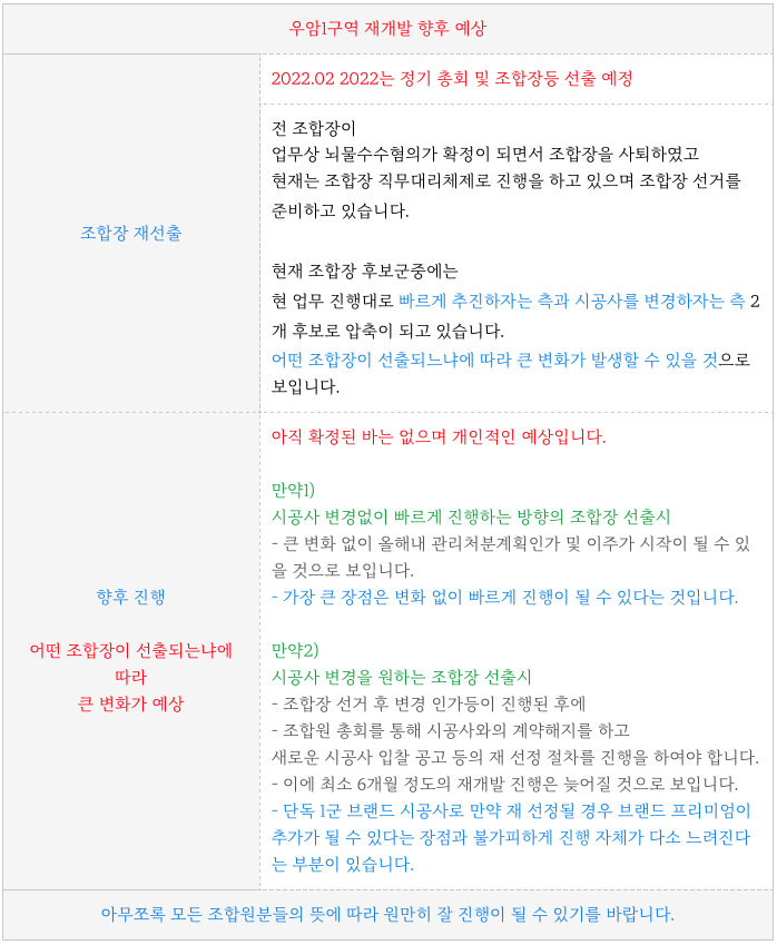 기존 시공사 유지이냐, 또는 해지후 새로운 시공사 선정으로 진행이 되느냐가 좌우될 것으로 보입니다.