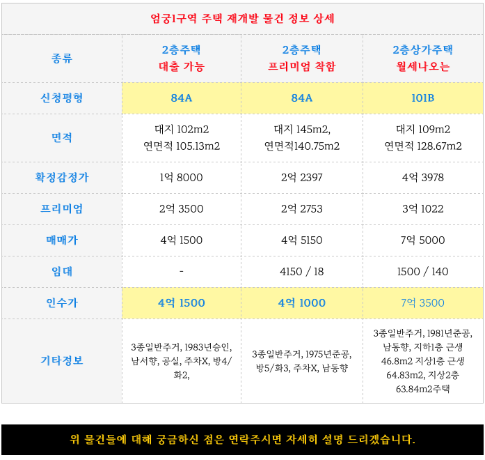확정 종전자산평가(감정평가) 금액이 제시되어 정확한 프리미엄과 평형까지 확인하여 매수 하실수 있습니다.