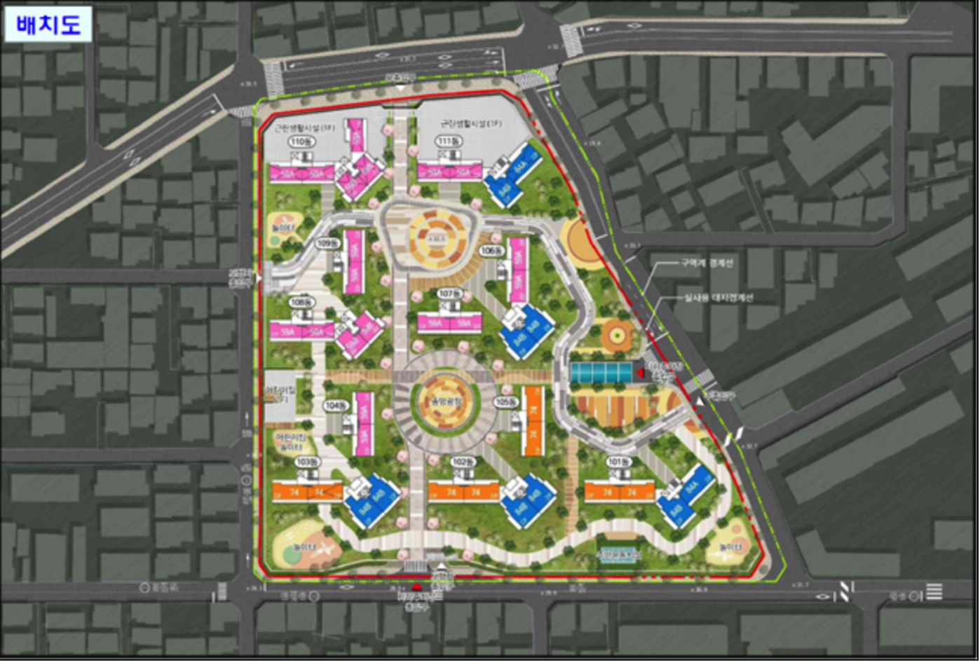 아파트 주동 수를 줄이고 단지 중앙에 대규모 중앙광장을 배치하여