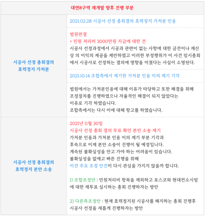 현재 시공사 선정 총회에 대한 소송이 제기 되어 있고 가처분까지 인용이 된 상황입니다.