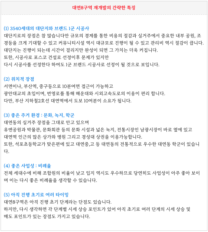 대연동의 잠룡 대연8구역 재개발의 간략한 특징들입니다.