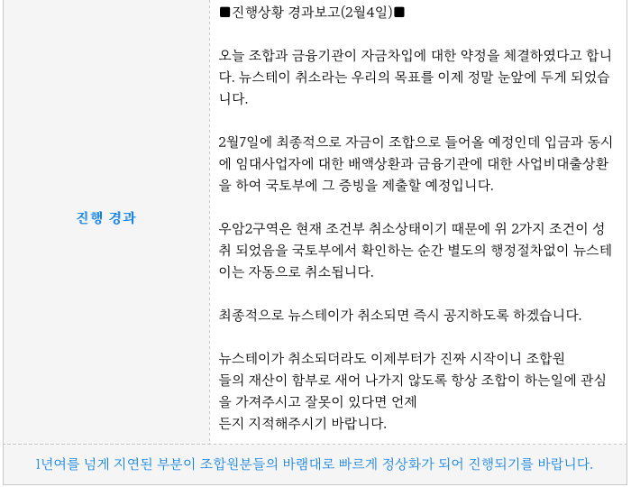 조합측에서는 2월 4일 아래와 같이 조합원 분들에게 공지를 하였습니다.