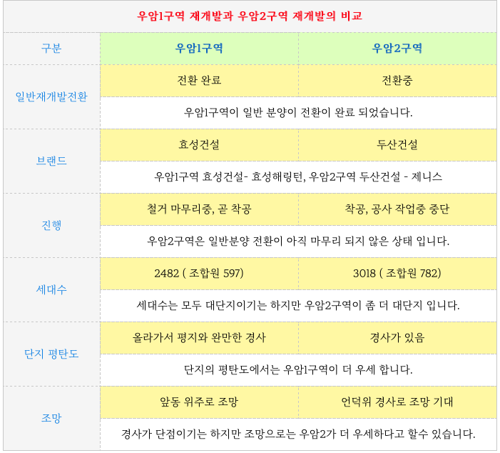 우암1구역 재개발과 우암2구역 재개발의 상대 비교 부분입니다.