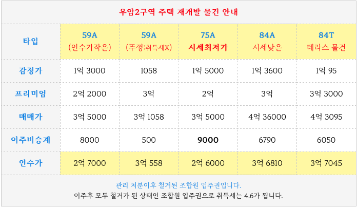 우암2구역 재개발의 현재 타입별 세대수와 조합원 분양가입니다.