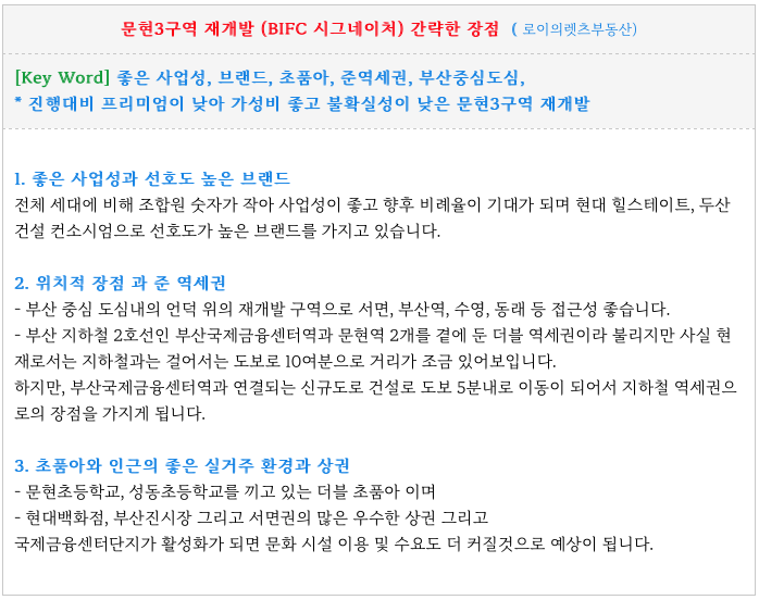 [Key Word] 좋은 사업성, 브랜드, 초품아, 준역세권, 부산중심도심,