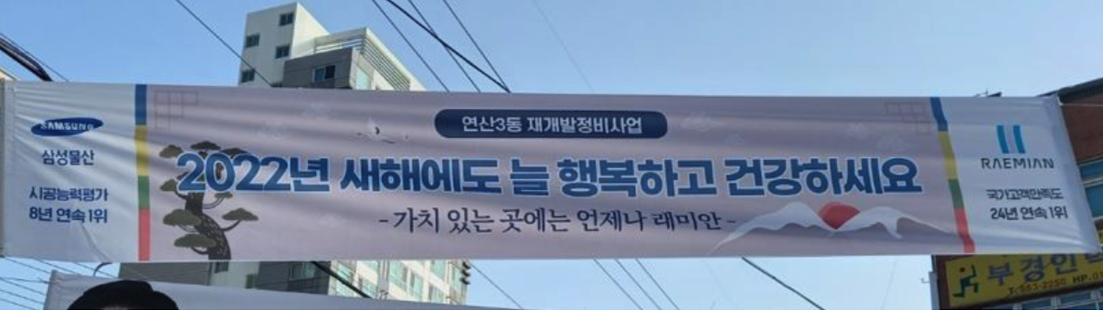 부산 최고 선호도를 가진 삼성 래미안의 플랜카드 가 붙어서 더욱 기대감이 높아지고 있습니다.