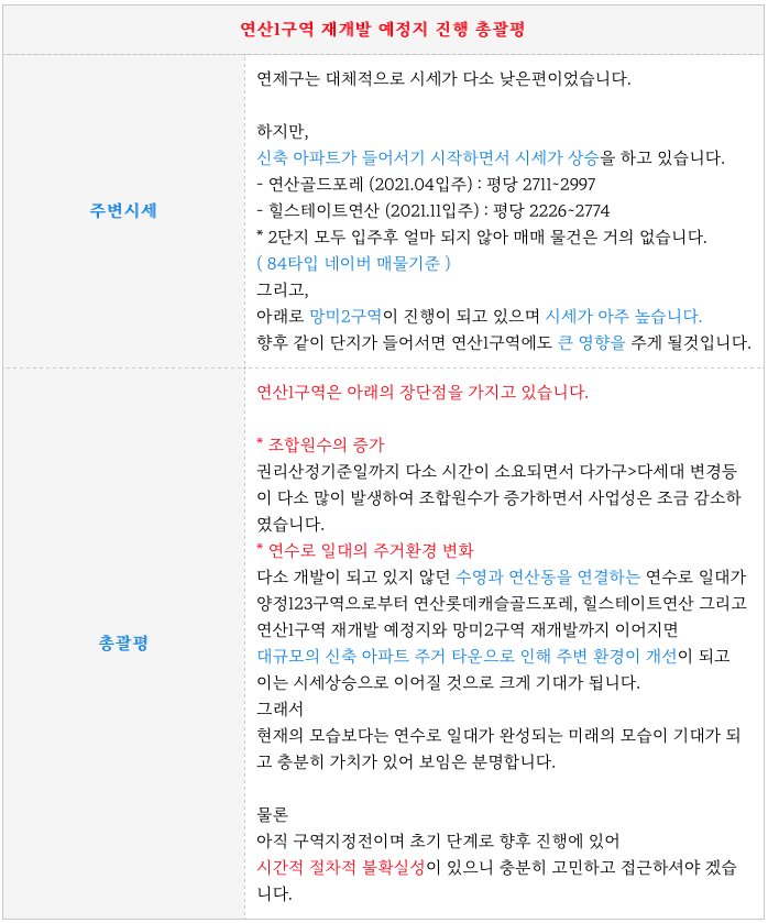 역세권 연산1구역 재개발 예정지의 개인적인 총괄평입니다.
