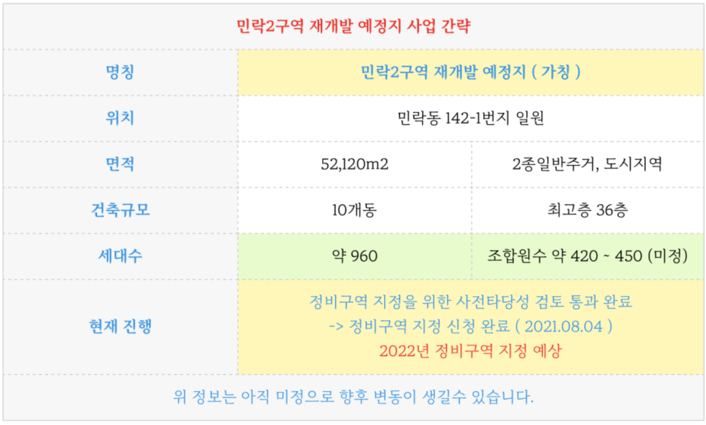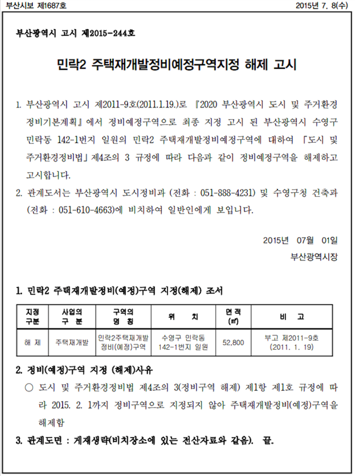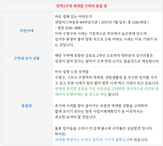 민락2구역 재개발 예정지의 노후도, 진행상황 정리등은 아래 페이지를 참고 부탁드립니다.