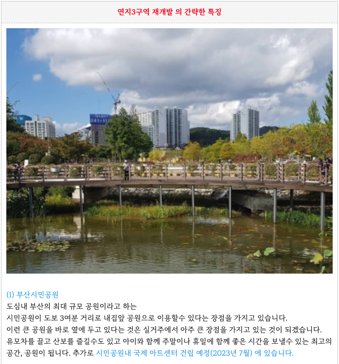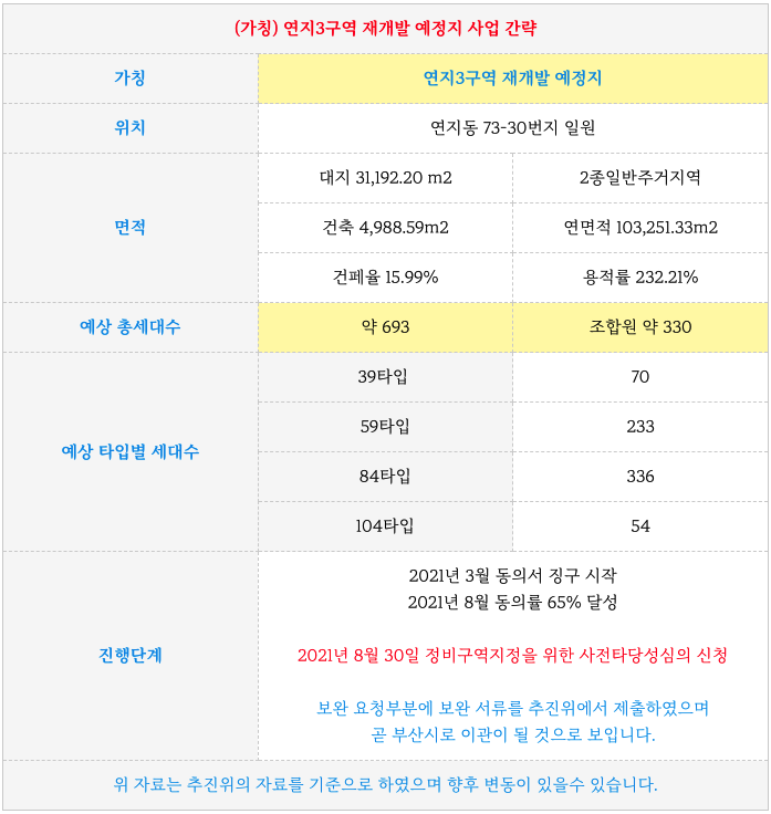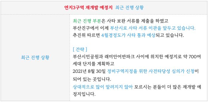 연지3구역 재개발의 간략한 특징을 다시 한번 정리하였습니다.