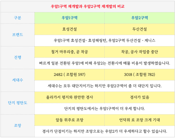 우암1구역 재개발과 우암2구역 재개발의 간략 비교 부분입니다.
