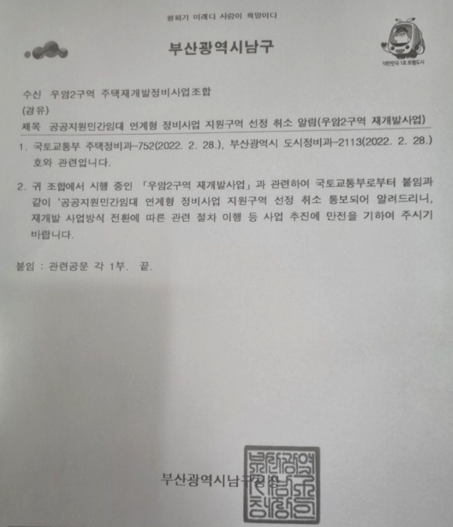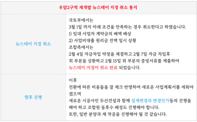 우암2구역 재개발의 뉴스테이 지정 취소 통지 되었습니다.