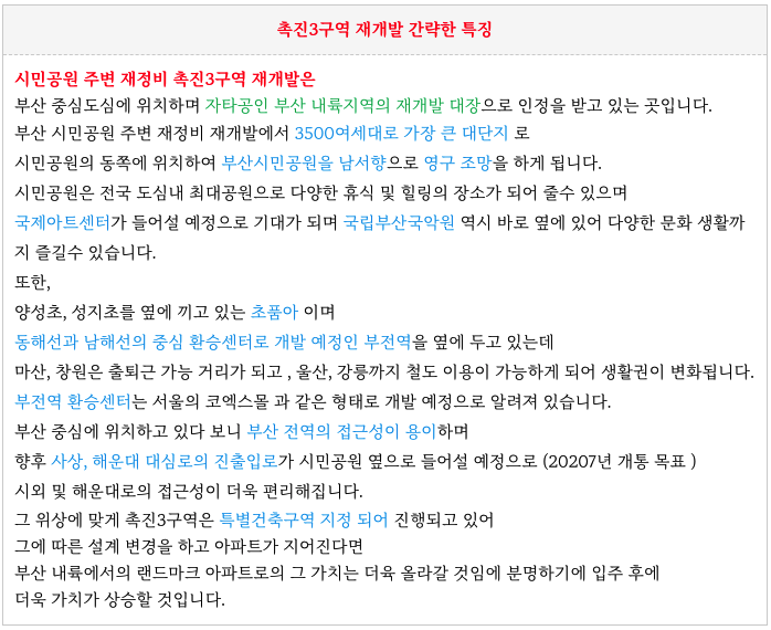시민공원 촉진3구역 재개발의 간략한 특징 입니다.