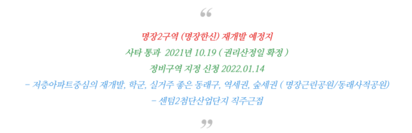 정비구역 지정 신청된 명장2구역 (명장한신) 재개발 예정지의 물건 정보 업데이트 해 드리겠습니다.