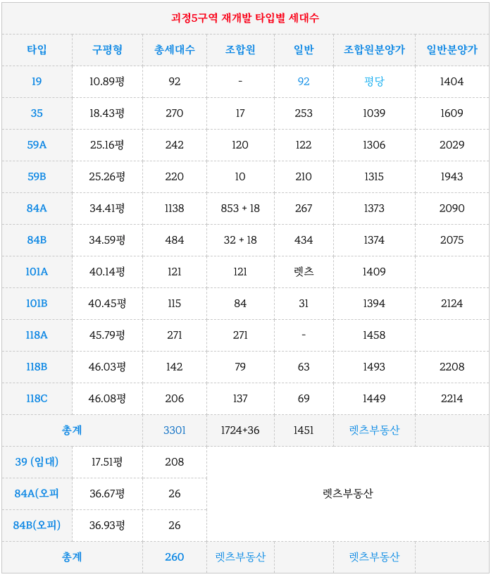 괴정5구역 재개발의 각 타입별 조합원 분양가와 세대수 입니다.