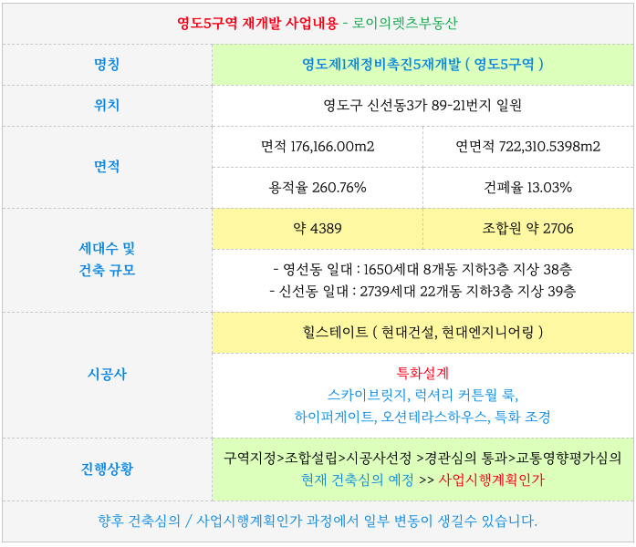 아름다운 영도5구역 재개발의 간략한 특징을 정리 드립니다.