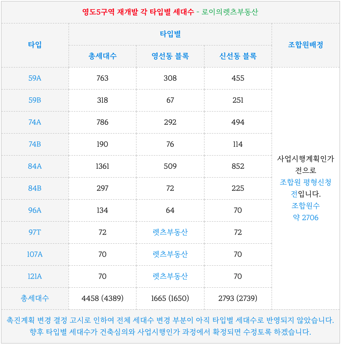 아름다운 영도5구역 재개발의 현재 타입별 세대수 입니다.