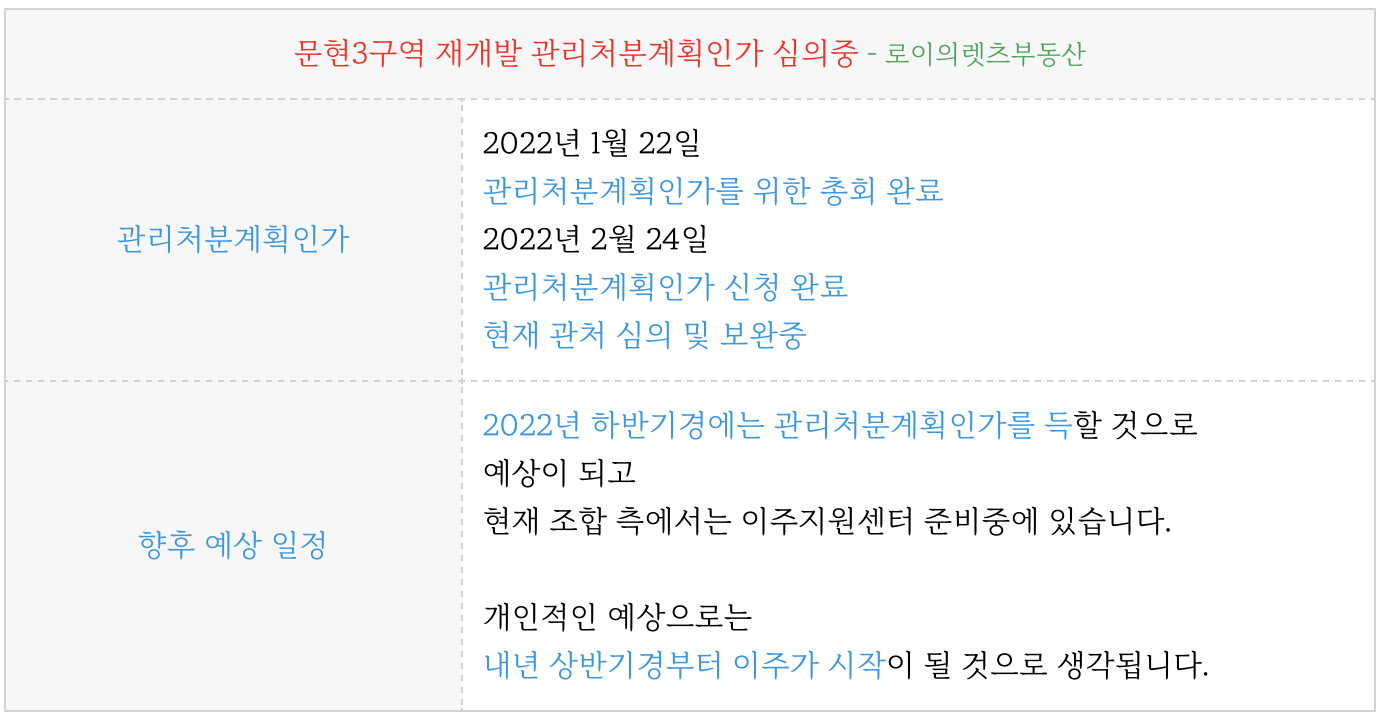 현재 심의 및 보완중에 있으며 하반기 경에는 관리처분계획인가를 득할 것으로 예상이 되고 있습니다.