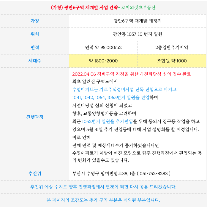 사타심의중 "광안6구역 재개발 (예) : 추가편입소식 " & 소액 인수가 매물 안내