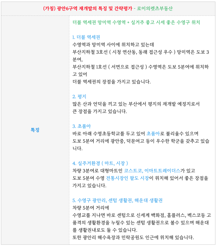광안6구역 재개발 예정지 의 특징을 간략히 정리해 드리겠습니다.