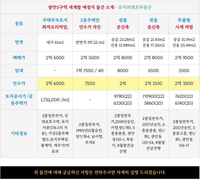 수영구 광안5구역 재개발 예정지의 새롭게 접수된 좋은 물건들을 소개해 드리겠습니다.