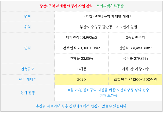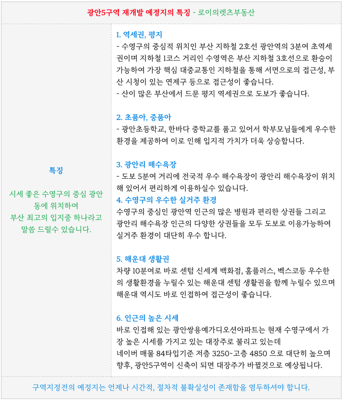 수영구 광안5구역 재개발 예정지의 우수한 특징을 간략하게 정리하여 드리겠습니다.
