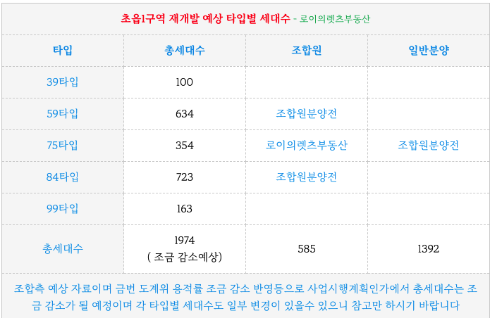초읍1구역 재개발 예상 타입별 세대수 입니다.