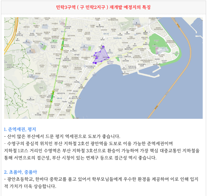 민락3구역 ( 구 민락2지구 ) 재개발 예정지의 특징을 간략히 정리하였습니다.