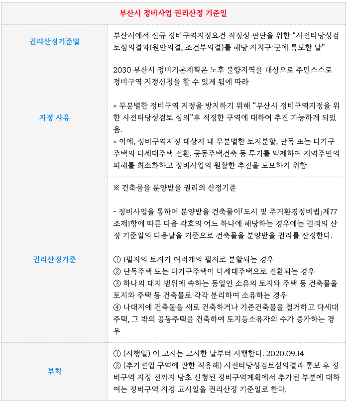 권리 산정일이 중요하므로 부산시의 정비사업 권리산정 기준일 참고 하시면 좋습니다.