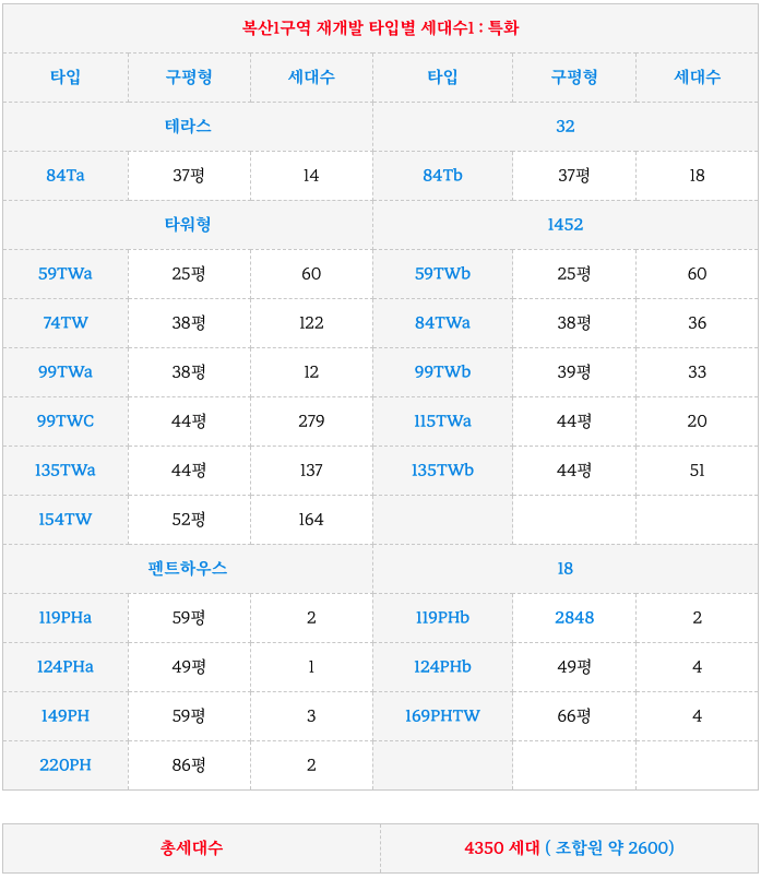 복산1구역 재개발 의 각 타입별 세대수입니다.