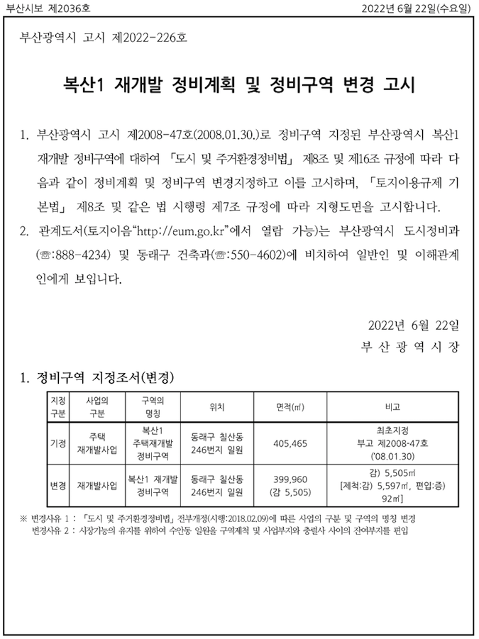 지난 도시계획위원회 심의 결과에 따라 정비계획 및 구역 변경 고시가 있었으며