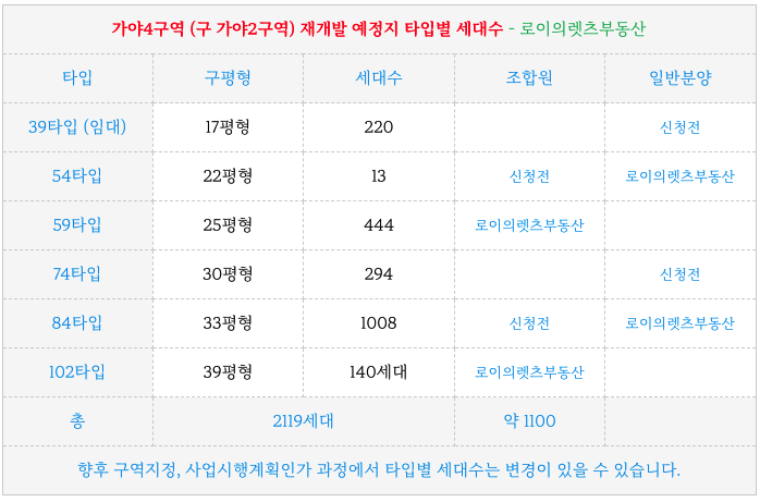 가야4구역 (구 가야2구역) 재개발 예정지의 타입별 세대수 입니다.