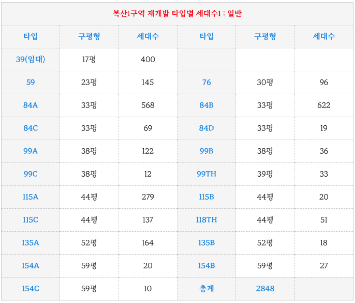 복산1구역 재개발 의 각 타입별 세대수입니다.