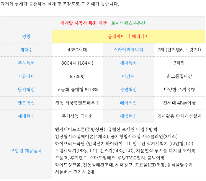 복산1구역 재개발 ( 동래자이 더 헤리티지) 의 고급화 / 특화 제안 내용 부분 입니다.