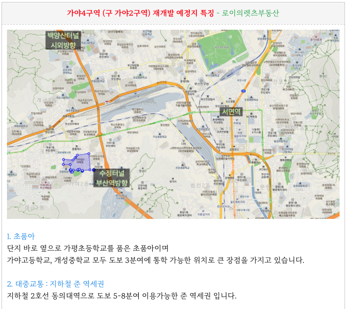 가야4구역 재개발 예정지의 간략한 특징들을 정리해 드리겠습니다.