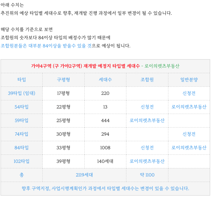 가야4구역 재개발 예정지의 추진위의 예상 타입별 세대수 입니다.